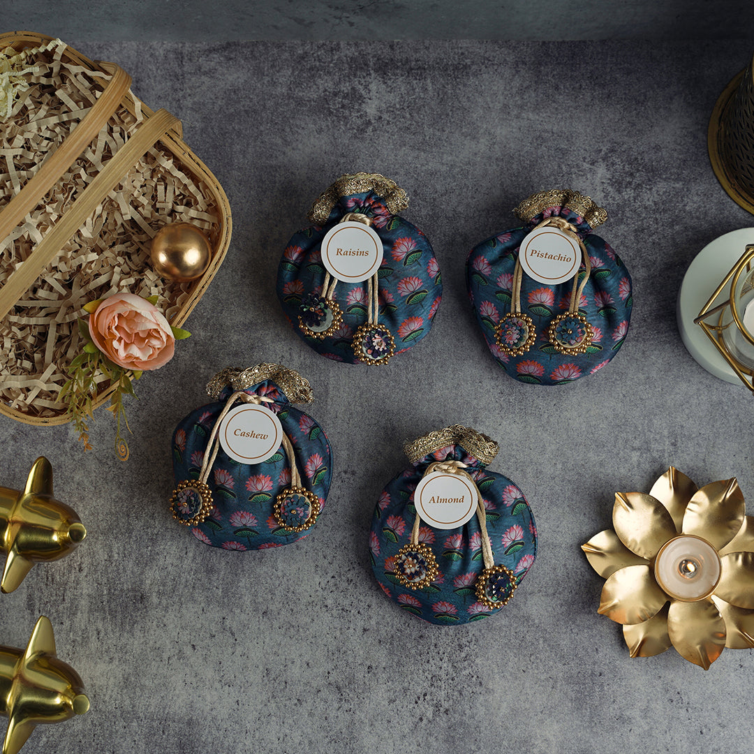 This elegant gift hamper brings together a carefully selected assortment of premium dry fruits and nuts, thoughtfully packed in handcrafted potli bags. Each element reflects a blend of tradition and simplicity, making the hamper suitable for a wide range of occasions.