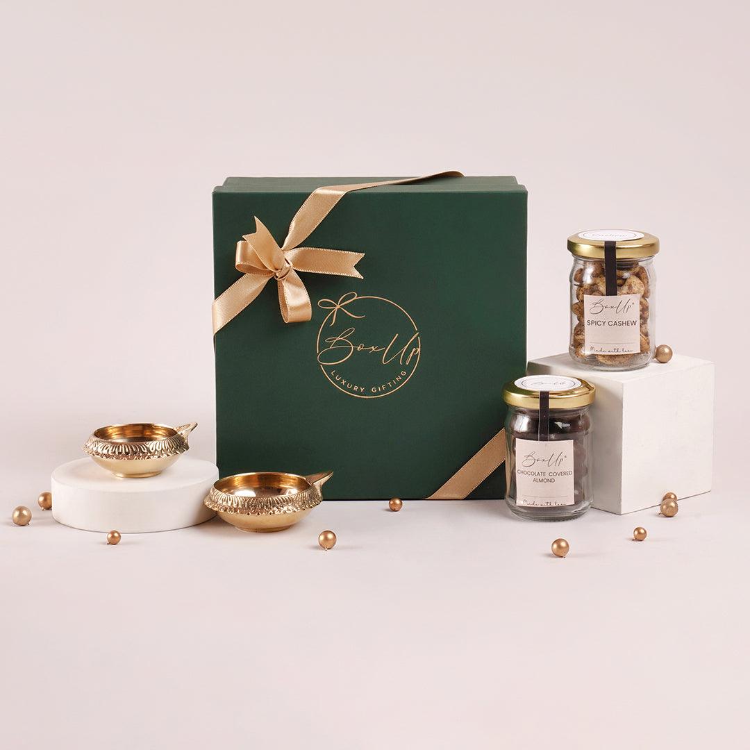 We’ve heard big surprises come in small packages and this Diwali hamper is a testament to that. Thoughtfully curated to embody the spirit of Diwali, this Diwali hamper has a set of brass diyas that have traditional etching on the edges. These diyas were traditionally lit with cotton wicks with oil or ghee. More modern methods like beeswax cubes with wicks or battery diyas can also be used alternatively. The hamper also has a glass of chocolate covered almonds, a light and tasty snack and a glass jar of spicy cashews, a rich, savory snack. These snacks are sure to tickle one's taste buds and be great to accompany a fun teatime conversation!
