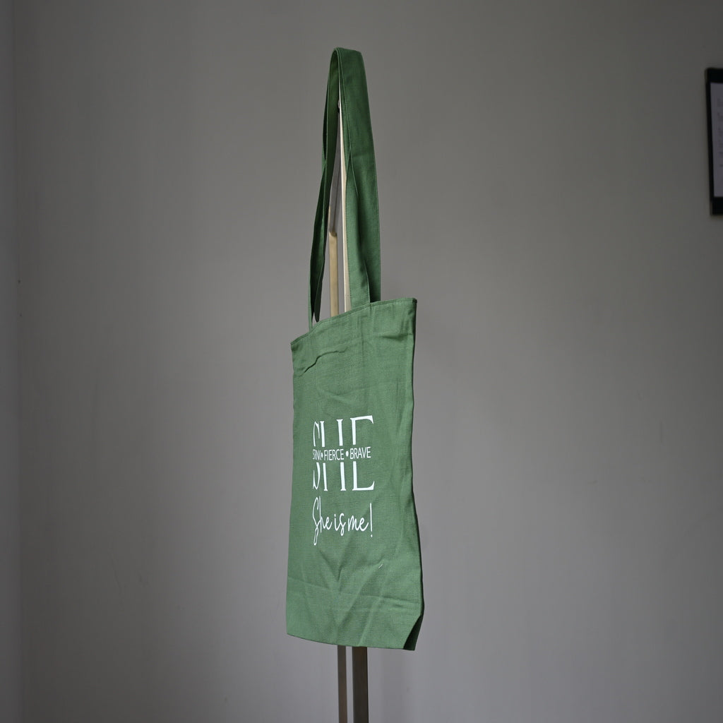 Upgrade your everyday style with the Emerald She Signature Tote, designed to reflect confidence, individuality, and modern minimalism. Crafted from durable, eco-friendly canvas, this tote features a rich emerald green tone paired with a bold “She is me!” statement print, making it perfect for those who love expressive yet subtle designs. Lightweight yet sturdy, it is ideal for carrying your daily essentials with ease—whether you're heading to work, college, or a casual outing.