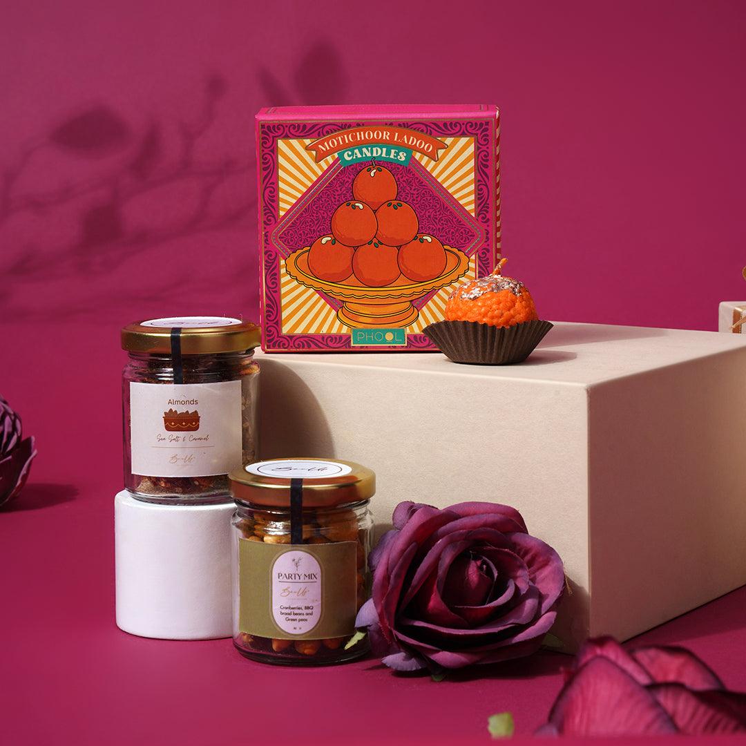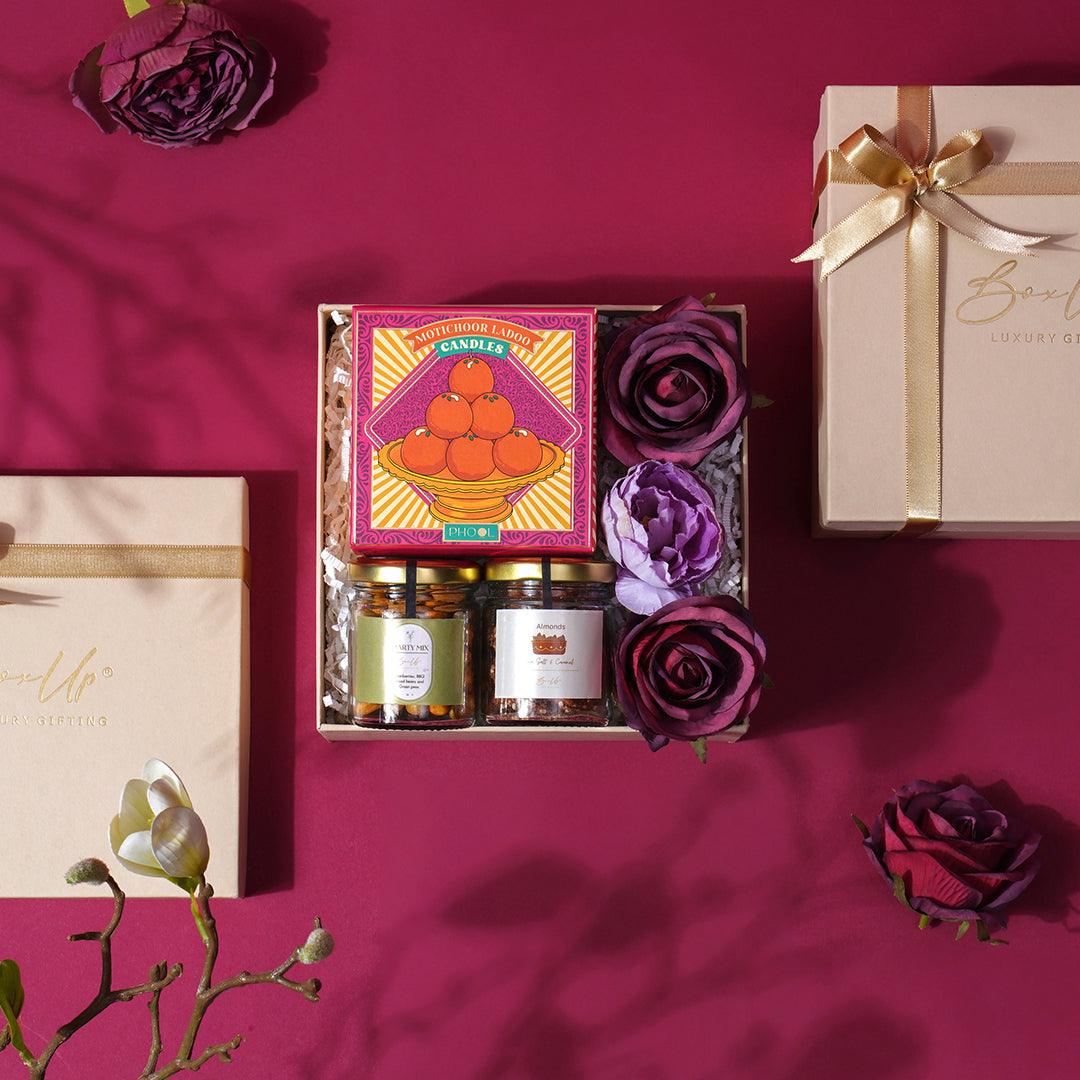 Inspired by traditional sweets, this hamper holds delightful treats but with a twist. From melt-in-the-mouth sweet candle to vibrant flowers, every element of this hamper brings a reminder of joy that comes by sharing moments.