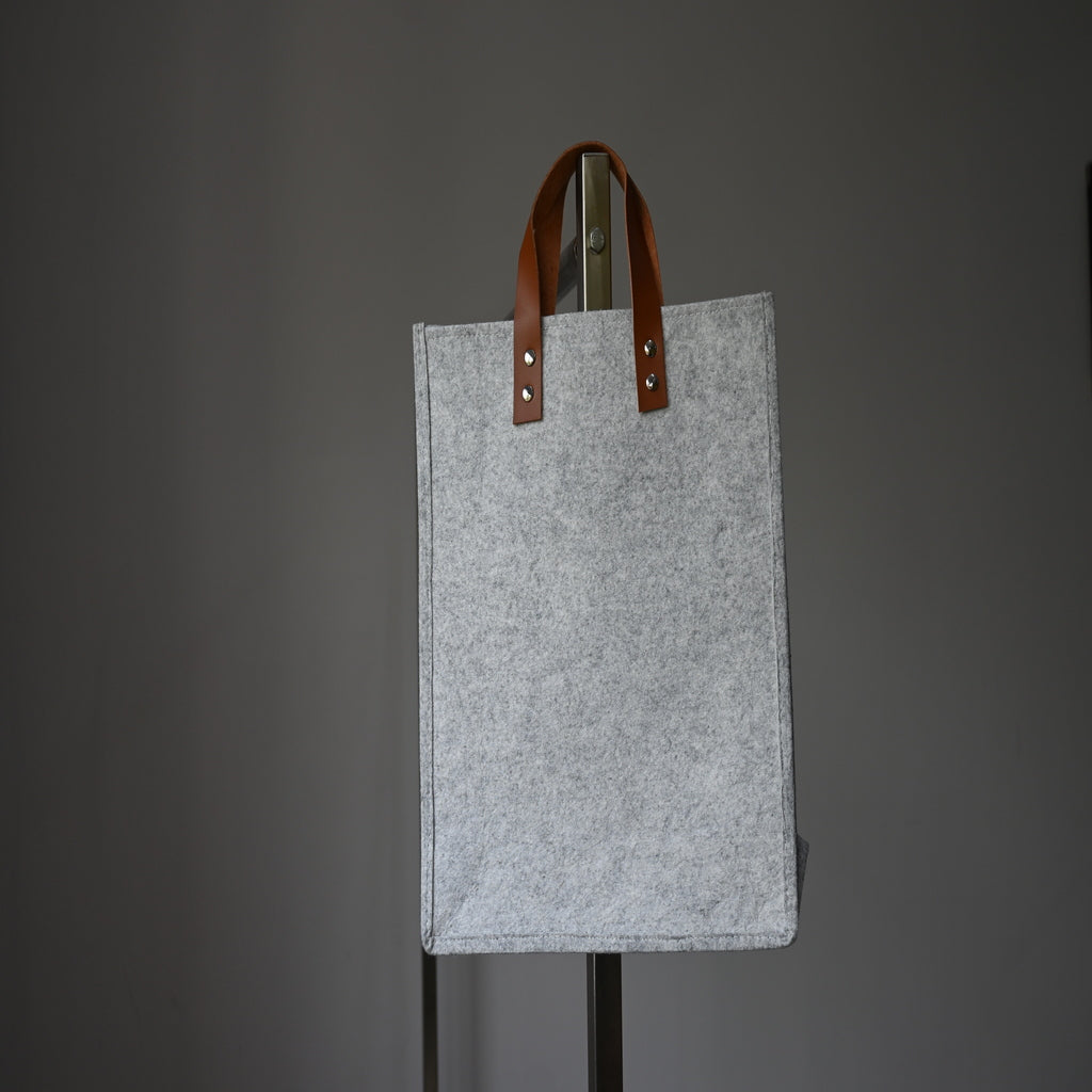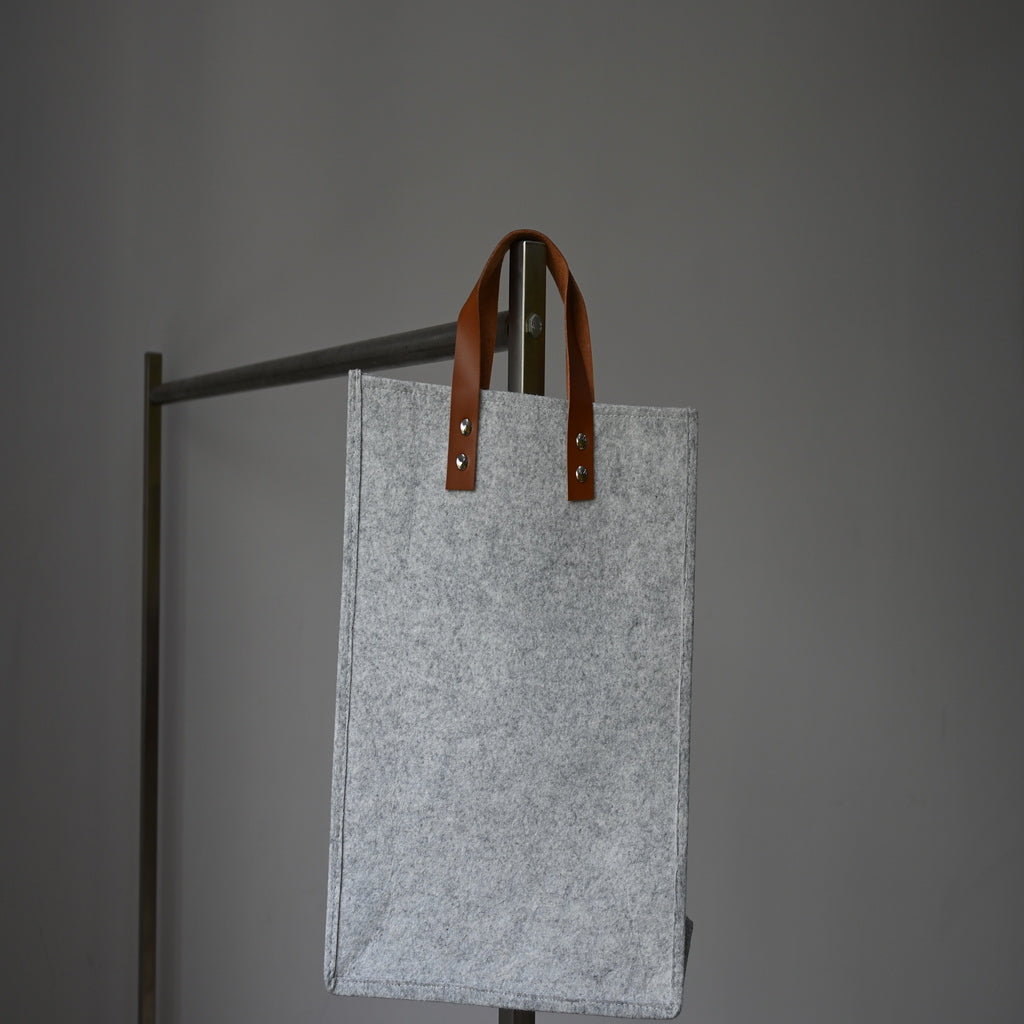 Crafted from high-quality thick felt fabric, the bag maintains its shape while remaining lightweight and easy to carry. The premium brown leather handles, secured with sturdy metal rivets, add a sophisticated contrast and enhanced durability.