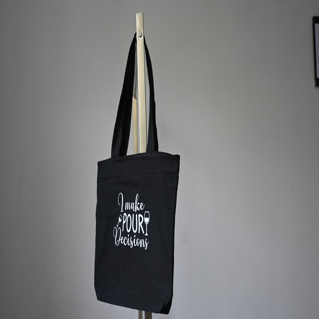 Add a splash of humor to your everyday style with this chic Black “I Make Pour Decisions Black Canvas Tote Bag” Canvas Tote Bag. Featuring playful typography with a stylish wine glass graphic, this tote is perfect for wine lovers and anyone who enjoys witty fashion statements.