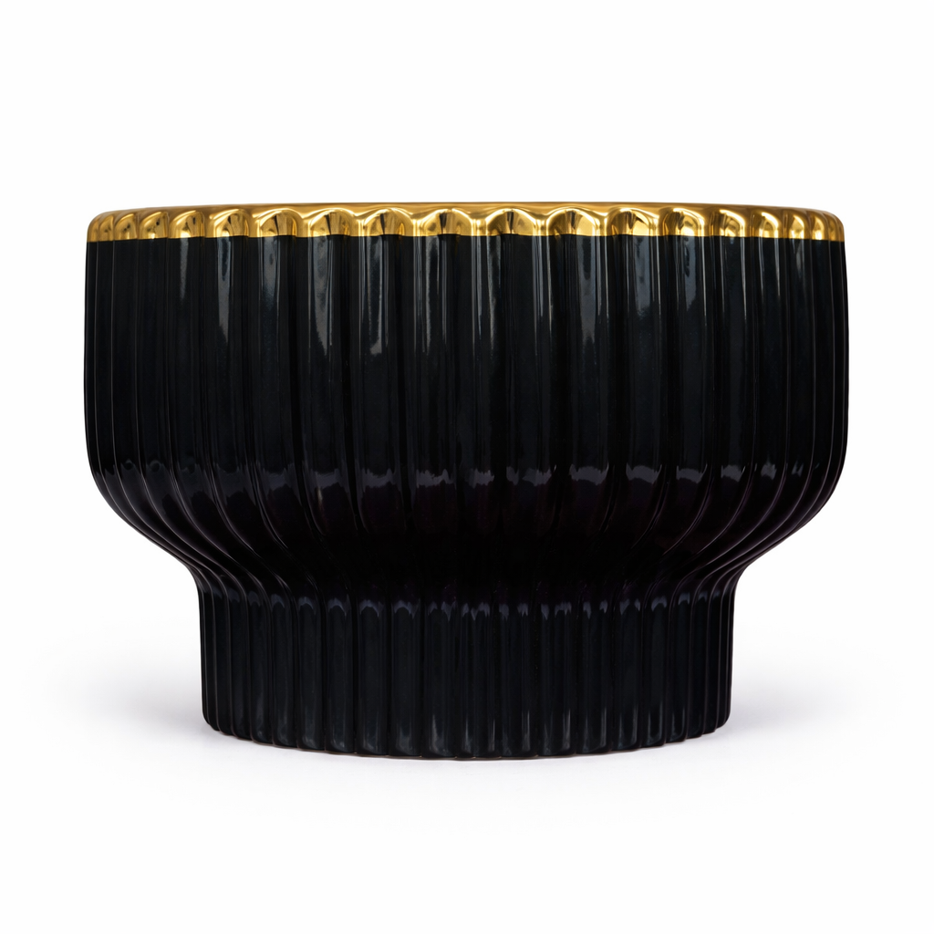Introduce bold elegance to your living space with this luxury black ribbed ceramic planter featuring a refined gold rim finish.