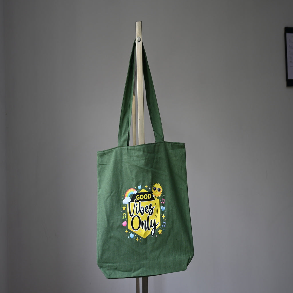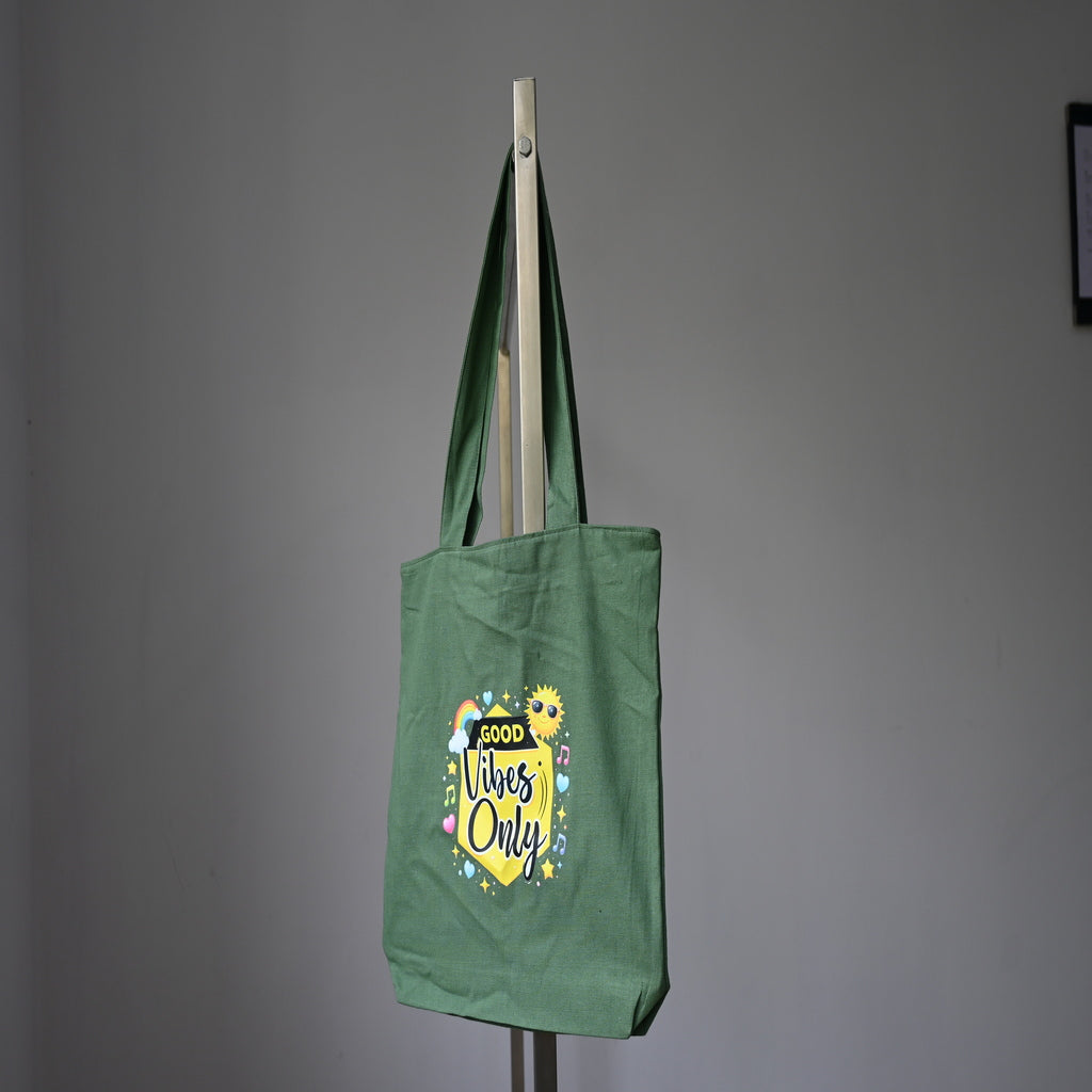 Its rich green color combined with the colorful printed graphic makes it a standout fashion piece while remaining eco-friendly and reusable.